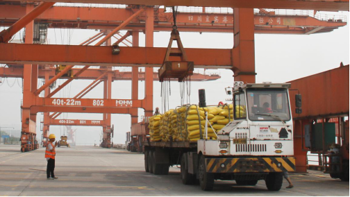 国庆节期间,当人们纷纷探亲访友、外出游玩的时候,宜宾港码头则是一派繁忙的景象,来自腹地市场的磷矿通过汽运到港,正快速高效的进行装箱;来自于金沙江流域的磷酸一铵通过散船转运至港口已完成装箱,准备发往东北;同时,氯化铵、钢卷也在快速的完成装船作业,中车第二批发往澳大利亚机车头也在平稳安全的进行装船作业,五粮液粮食供应商的粮食也正在有条不紊地起吊。公司各个工种工人坚守岗位,以节日大会战欢度国庆节,向祖国生日献礼。